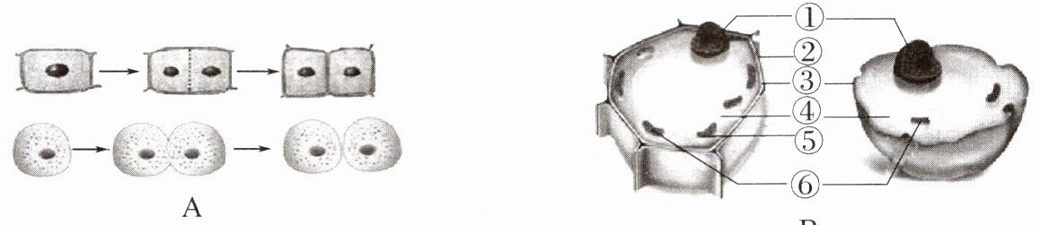 的过程,其结果是细胞数目增加。(2)图 B 中两种细胞比较,植物细胞特有的结构是 [ ]
