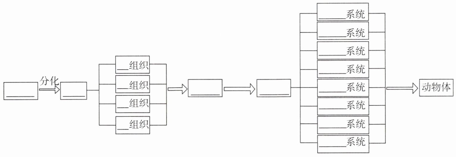 受精卵;细胞;上皮;肌肉;神经;结缔;器官;系统;运动;消化;呼吸;循环;泌尿;神经;内分泌;生殖