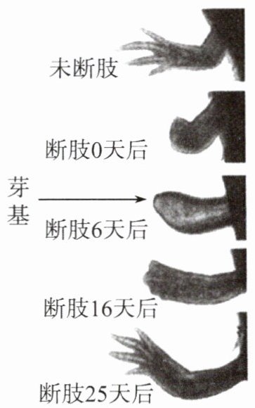 4. 一些鱼类和两栖动物具有再生能力,为了解这一过程是如何发生的,同学们查阅了相关资料。右图为蝾螈断肢再生的过程图,请回答下列问题: