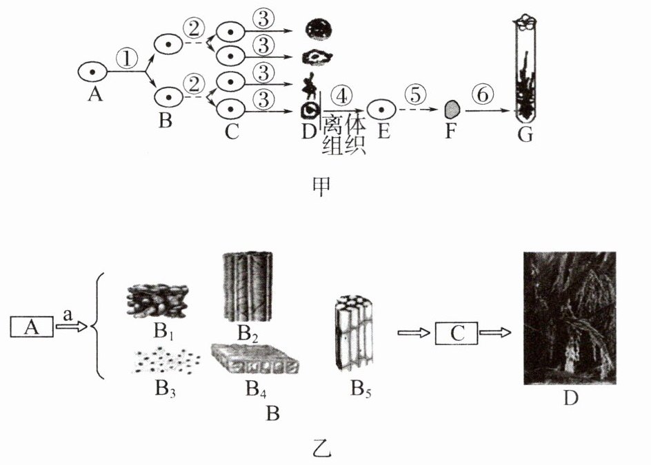 4. 2022年10月12日16时,“天宫课堂”第三课在中国空间站开讲,新晋“太空教师”陈冬、刘洋、蔡旭哲为广大青少年带来一场精彩的太空科普课。这是中国航天员首次在问天实验舱内进行授课。在课堂上航天员重点介绍了在中国空间站开展的水稻和拟南芥种植研究情况,图甲是拟南芥组织培养的概括图,图乙是水稻植物体结构层次示意图,请据图分析回答问题: