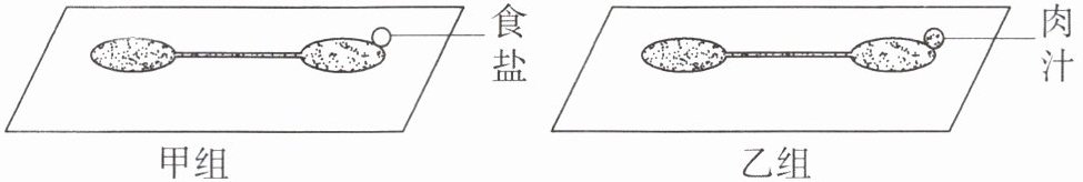 13. 某同学为探究草履虫的应激性,做了以下实验:在甲、乙两组载玻片上各滴加一滴草履虫培养液,然后在甲组载玻片一侧放一小粒食盐,在乙组载玻片一侧滴加一滴肉汁,如图所示。下列叙述错误的是(