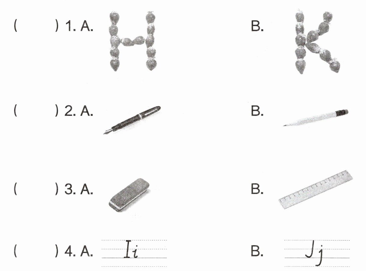 Ⅱ. Listen and choose. (同学们在交流新学的文具名称和四个英文字母,请根据听到的内容选出合适的选项。)