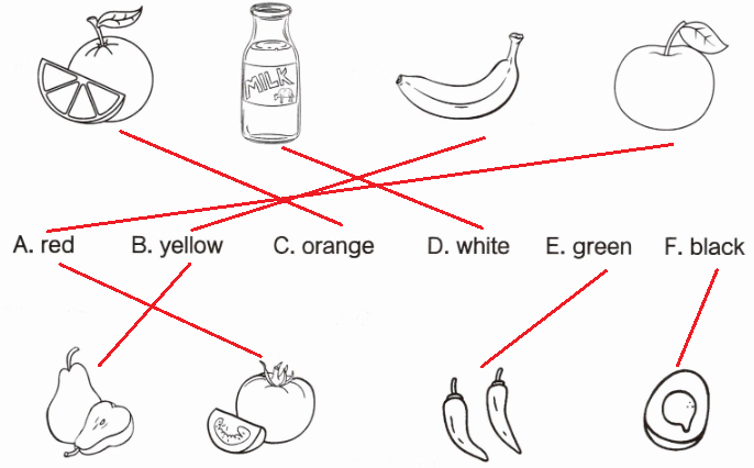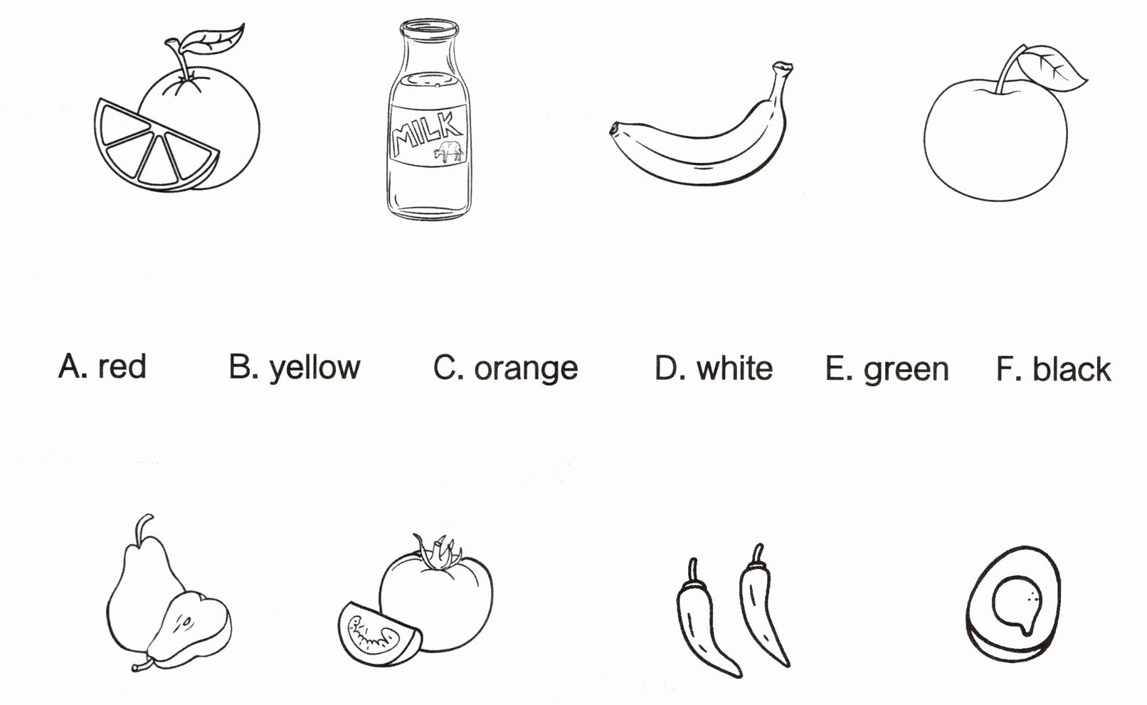 Ⅳ. Colour and match.(午餐时间到了,佐伯在餐厅里看到了各种美味的食物,它们都是什么颜色的呢?请你涂一涂,并连线。)