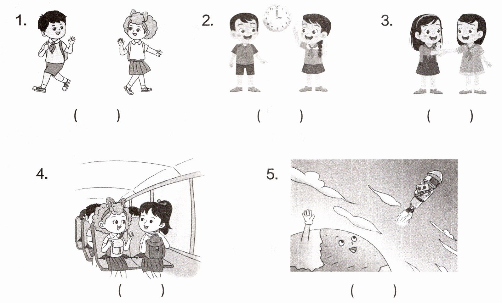 Ⅱ. Listen and tick or cross.(张老师给鲁鲁展示了礼貌用语小视频,但鲁鲁没看清,快来帮帮他。听录音,音频与画面相符打“√”,不相符打“×”。)