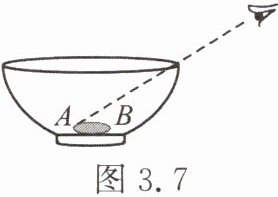 14. 如图 3.7 所示,将一枚硬币放在空碗底部,然后退到眼睛恰好看不到硬币的位置,保持眼睛、碗和硬币的位置不变,缓缓向碗里倒水,随着水面升高,又看到了“硬币”。其实看到的硬币是变浅的