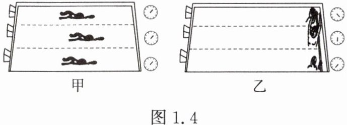 16. 如图 1.4 所示,游泳运动员比赛时比较运动快慢的两种方法,其中______