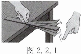 例1 如图2.2.1所示,将一把钢尺紧按在桌面上,一端伸出桌边,拨动钢尺,听它振动发出的声音。改变拨动钢尺的力度,一次轻轻拨动,一次用力拨动,听钢尺发出声音的变化。这个实验用来探究(