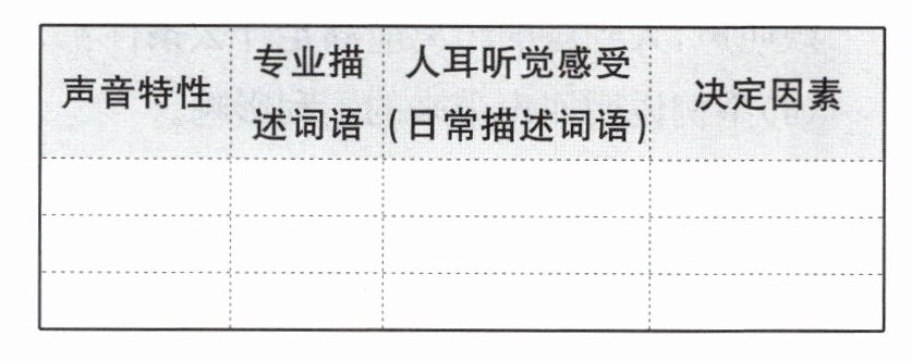 |声音特性|专业描述词语|人耳听觉感受(日常描述词语)|决定因素|
