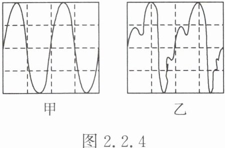 6. 声波仪接收到的两种声音的波形图如图2.2.4所示。比较波形图,回答问题。