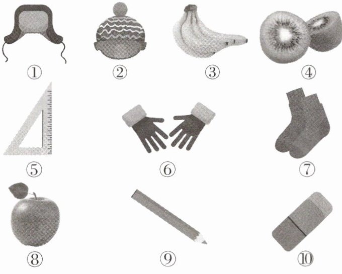 穿戴:①②⑥⑦;食用:③④⑧;学习文具:⑤⑨⑩ 还可以按照物体颜色、大小、导电性、硬度、形状等进行分类。