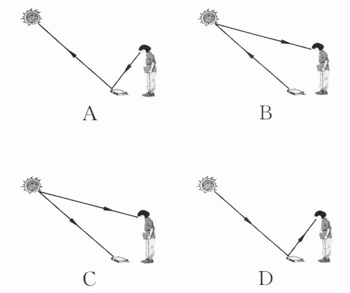 1. 晴朗的白天,一位同学走在校园里,忽然看到地上有一本书。下列关于该同学“看到书”的光路图正确的是(