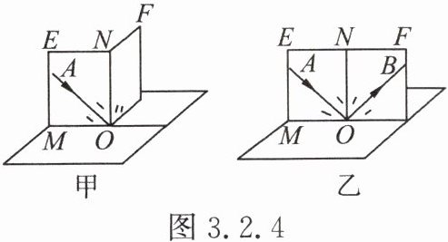 3. 某实验小组“探究光的反射规律”的实验装置如图3.2.4所示,平面镜M放在水平桌面上,E、F是两块粘接起来的硬纸板,而且F板可绕ON转动。