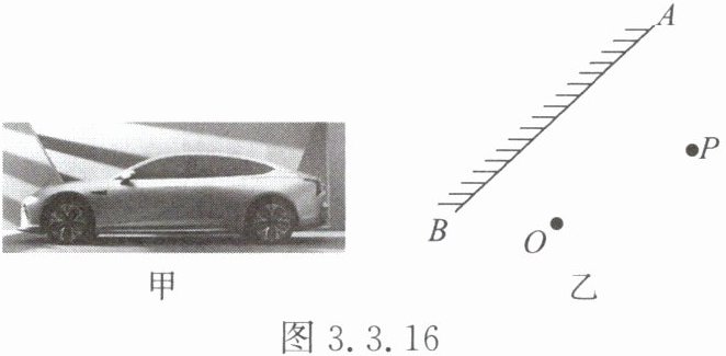 10. 如图 3.3.16 甲所示,夜晚时打开车内的照明灯时,驾驶员通过前挡风玻璃反射可以看到驾驶台上放置的物品。请在乙图中画出对应的光路图,AB 为挡风玻璃,O 点为驾驶台上物品,P 点为驾驶员的眼睛。