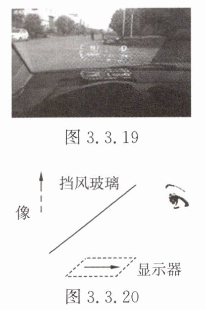 汽车平视显示系统(Head-Up-Display),简称 HUD。HUD 是为了高速行驶的车辆而研发,在高速行驶时,如果驾驶员低头观看仪表信息,在前方遇有紧急情况就有可能因来不及采取有效措施而造成事故。HUD 是利用平面镜成像原理(图 3.3.19),将显示器上的重要行车数据通过前挡风玻璃投射在正前方(图 3.3.20),驾驶员透过挡风玻璃往前方看的时候,能够轻易地将车外的景象与车辆信息通过挡风玻璃所成的像融合在一起,驾驶员不必低头,就可以看到车辆信息,如车速、油耗、导航等,从而避免分散对前方道路的注意力;同时,驾驶员不必在观察远方的道路和近处的仪表之间调节眼睛,确保驾驶舒适安全。