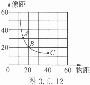 6. 在做“探究凸透镜成像的规律”实验时,某实验小组所描绘的图线如图 3.5.12 所示。图中$A$、$B$、$C$三点分别与蜡烛在光具座上移动过程中的三个位置相对应。下列说法正确的是(