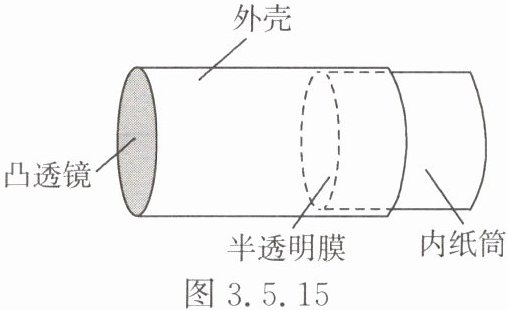 9. 如图 3.5.15 所示,某同学自制了一架模型照相机。已知凸透镜的焦距为 10cm,外壳的长度为 20cm。若将凸透镜对准窗外景物,在外壳内前后移动内纸筒,在半透明膜上可以得到景物