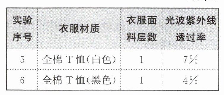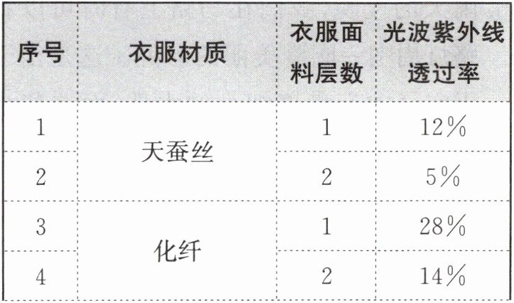 盛夏来临,人们为“怎样才能晒不黑”而发愁。资料表明:将皮肤晒黑的罪魁祸首是太阳光中的长波紫外线。某实验小组为此检测了若干衣服的防晒效果。