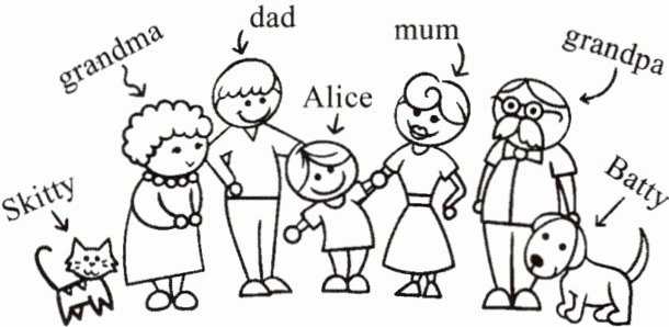 This is a photo of Alice's family. There are five people in her family. Alice is in the middle. She is a lovely girl. The man next to Alice is her father. He is tall. The woman next to Alice is her mother. She is beautiful. The old man and the old woman are her grandparents. Her grandpa has a mustache(胡子). Her grandma is very kind. There is also a cat named Skitty and a dog named Batty in the family. Alice loves her family very much.