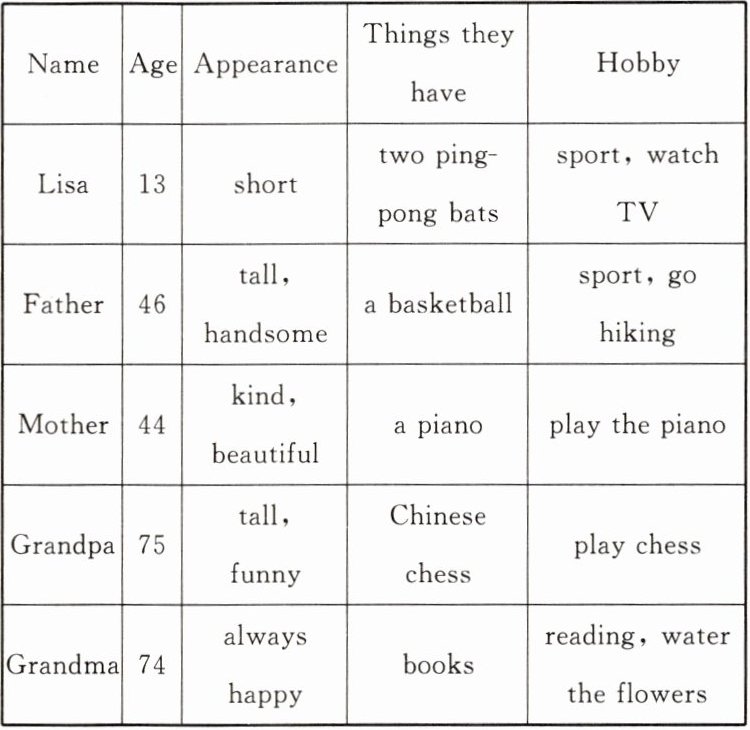 There are five people in Lisa’s family: Lisa, her father, her mother, her grandpa and her grandma.