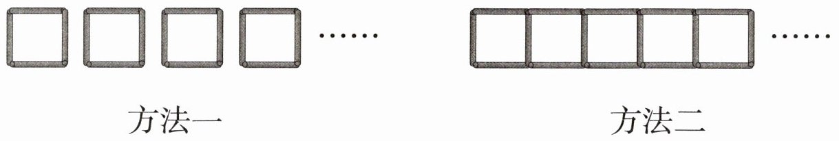 (3)有100根小棒,按方法一摆,最多能摆多少个正方形?按方法二呢?