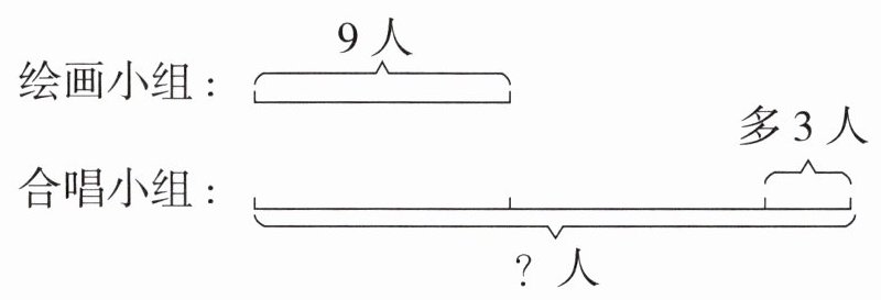 线段图中,上面线段表示绘画小组有$9$人,下面线段表示合唱小组的人数,合唱小组的人数比绘画小组的$2$倍还多$3$人,要求的是合唱小组的人数。