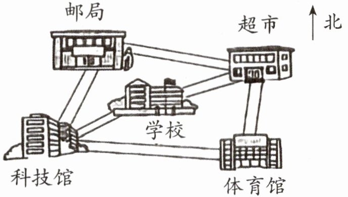 同样根据“上北下南,左西右东”,西南方向是左下方,以学校为观测点,左下方的建筑是科技馆,所以学校的西南方是科技馆。