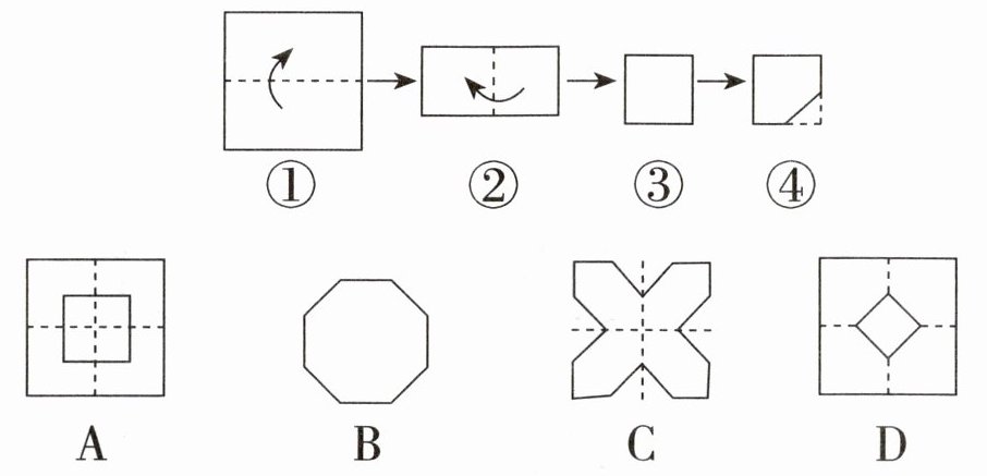 (6)如图,将一张正方形纸对折两次,得到一个小正方形,按照图④的样子剪去一个小三角形,将剩下的部分展开得到的图形是(