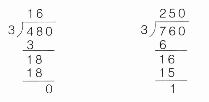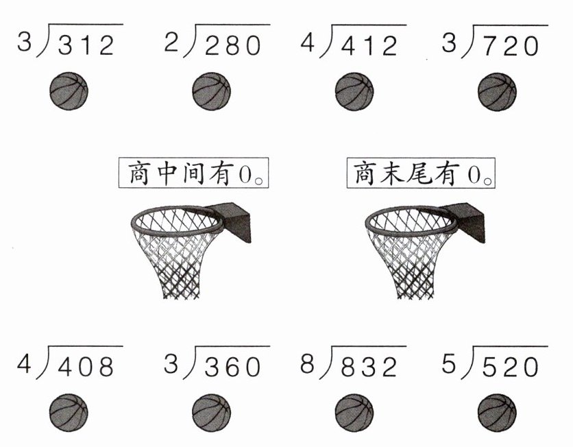 商中间有$0$:$312÷3$,$412÷4$,$408÷4$,$832÷8$,$520÷5$。