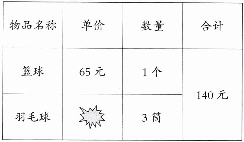 解析:本题考查减法和除法在实际问题中的应用,通过总价减去已知物品价格得到羽毛球总价,再除以数量得到每筒价格。