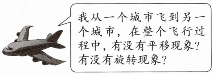 (2)飞机从一个城市飞到另一个城市的过程中,整体沿着一定的路线做直线或曲线移动,可看作是平移现象;飞机在飞行过程中,螺旋桨围绕中心轴做圆周运动,存在旋转现象。平移是飞机整体位置的改变,旋转是螺旋桨的运动,二者共同作用使飞机完成飞行任务。