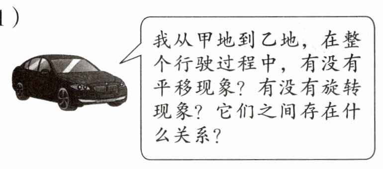 答案:(1)汽车从甲地到乙地的行驶过程中,整体是沿着直线方向做相同距离的移动,所以存在平移现象;汽车在行驶过程中,车轮围绕车轴做圆周运动,所以存在旋转现象。平移是汽车整体位置的移动,旋转是车轮的运动,它们共同完成了汽车从甲地到乙地的行驶过程。