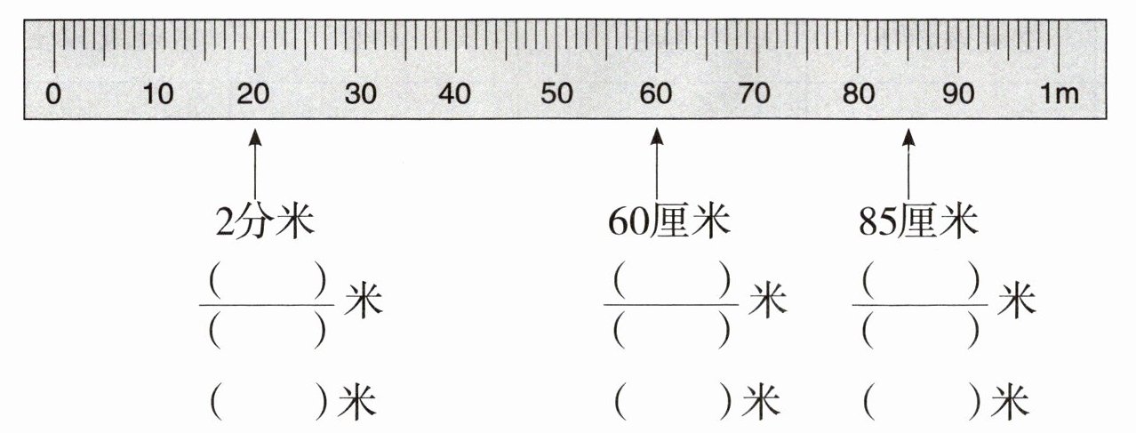 答案:$\frac{2}{10}$,$0.2$;$\frac{60}{100}$,$0.6$;$\frac{85}{100}$,$0.85$