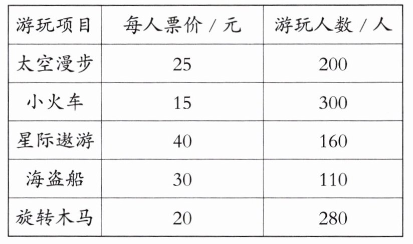 (1)对于“太空漫步”项目,已知每人票价为$25$元,游玩人数为$200$人,根据“总价 = 单价×数量”,可得收入为$25×200 = 5000$元。