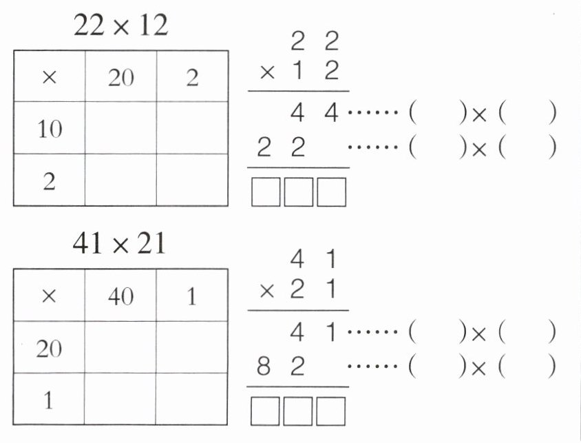 解析:本题考查两位数乘两位数(不进位)的计算方法,可通过圈一圈的方式将其中一个两位数进行拆分,再利用乘法分配律进行计算。