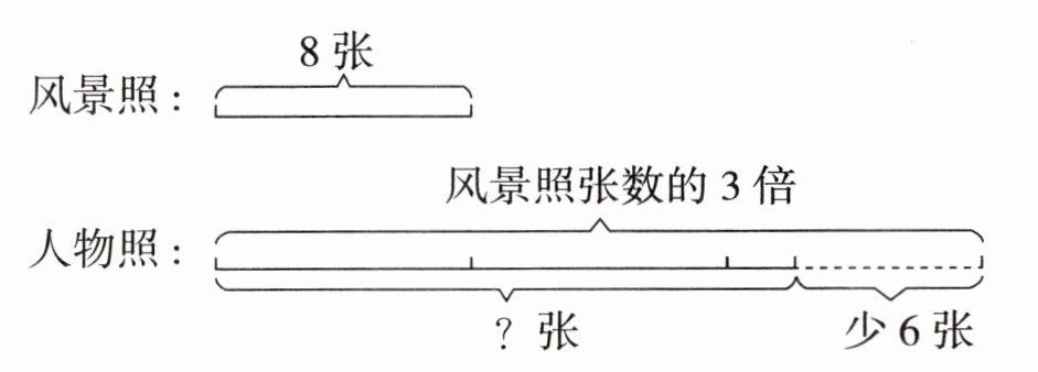 先算出风景照张数的$3$倍,即$8×3 = 24$(张),再减去少的$6$张,就能得到人物照的数量。
