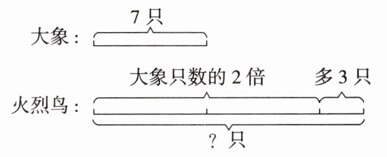 解析:本题可根据线段图获取大象和火烈鸟数量的关系,通过分析线段图可知,大象有$7$只,火烈鸟的数量是大象只数的$2$倍还多$3$只,要求火烈鸟的数量。