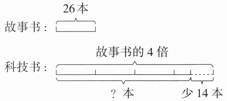 解析:本题考查通过线段图理解数量关系,利用故事书和科技书数量的倍数关系来列式计算。从图中可知科技书的数量是故事书的$4$倍少$14$本,故事书有$26$本,所以先算出故事书的$4$倍,再减去$14$本就是科技书的数量。