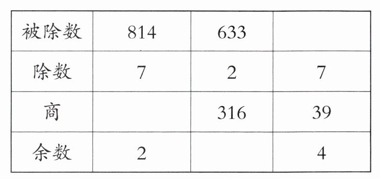 第一列:已知被除数是$814$,除数是$7$,余数是$2$,根据公式“商$ = ($被除数$-$余数$) ÷$除数”,可得商为$(814 - 2)÷7 = 812÷7 = 116$。