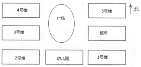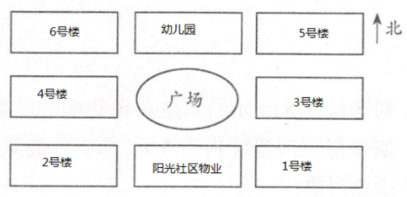 阳光社区物业大楼在广场的南面,幼儿园在广场的北面,1 号楼在广场的东南面,2 号楼在广场的西南面,3 号楼在广场的东面,4 号楼在 2 号楼的北面,5 号楼在幼儿园的东面,6 号楼在广场的西北面。