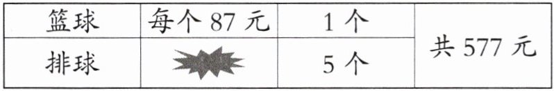 已知买$1$个篮球和$5$个排球总共花了$577$元,而每个篮球$87$元,那么买$5$个排球花的钱数就是总花费减去买篮球的花费,即:$577 - 87 = 490$(元)。