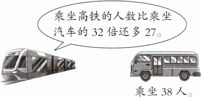 解析:本题考查倍数关系以及加法运算。乘坐高铁的人数比乘坐汽车的$32$倍还多$27$,已知乘坐汽车的有$38$人,那么乘坐高铁的人数为乘坐汽车人数的$32$倍加上$27$。