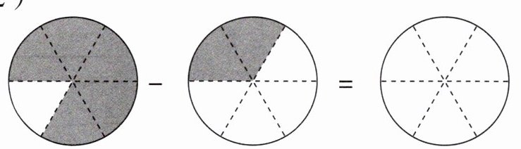 5个$\frac{1}{6}$减去2个$\frac{1}{6}$,剩下3个$\frac{1}{6}$,就是$\frac{3}{6}$(或$\frac{1}{2}$ )。