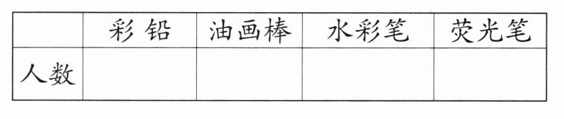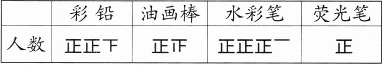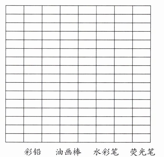 (2)图略(根据人数,彩铅涂12个格子,油画棒涂7个格子,水彩笔涂16个格子,荧光笔涂5个格子)。
