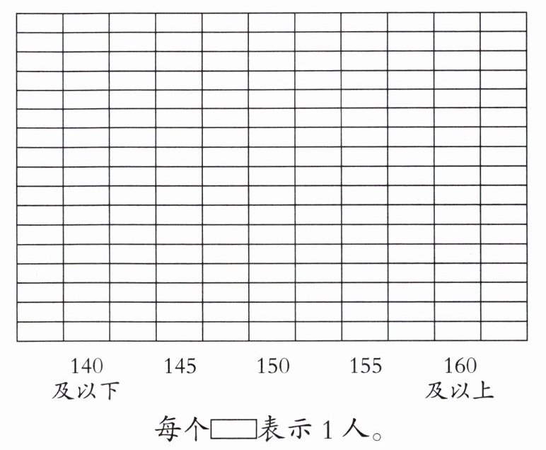 由于不知道班级具体人数情况,假设班级有30人,且人数分别为5、8、10、4、3(此数据仅为假设,实际应根据班级真实情况填写)。涂一涂时,140及以下涂5个小方格,145涂8个小方格,150涂10个小方格,155涂4个小方格,160及以上涂3个小方格。