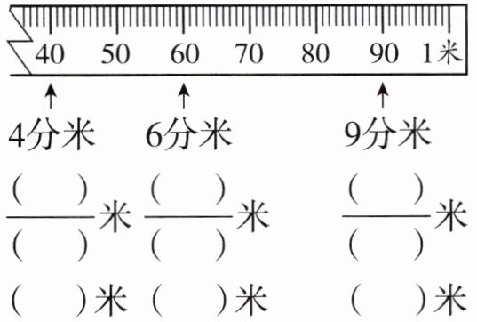 解析:本题考查长度单位的换算以及分数和小数的表示。图中尺子以分米为单位,根据$1\text{米}=10\text{分米}$,将分米换算为米,并用分数和小数表示。