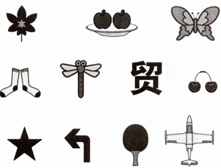 答案:圈出第一排的第一个(叶子)、第三个(蝴蝶);第二排的第一个(一双袜子)、第二个(蜻蜓)、第四个(两个樱桃);第三排的第一个(五角星)、第三个(乒乓球拍)、第四个(飞机)。
