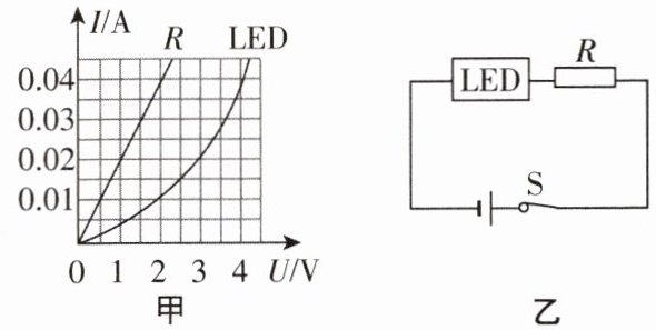 (2) 如图乙所示,将LED灯与R串联在电路中,若LED灯的电功率为0.06W,则R中的电流为