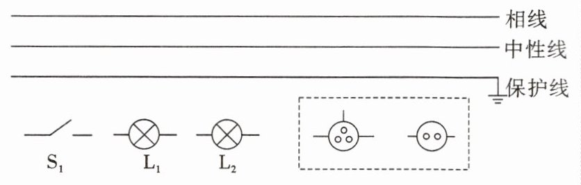 10. 请将下列的家庭电路连接完整,要求:(1)开关$ S_1 同时控制灯 L_1 $、$ L_2 $的亮暗;(2)两孔插座、三孔插座都接入电路中.