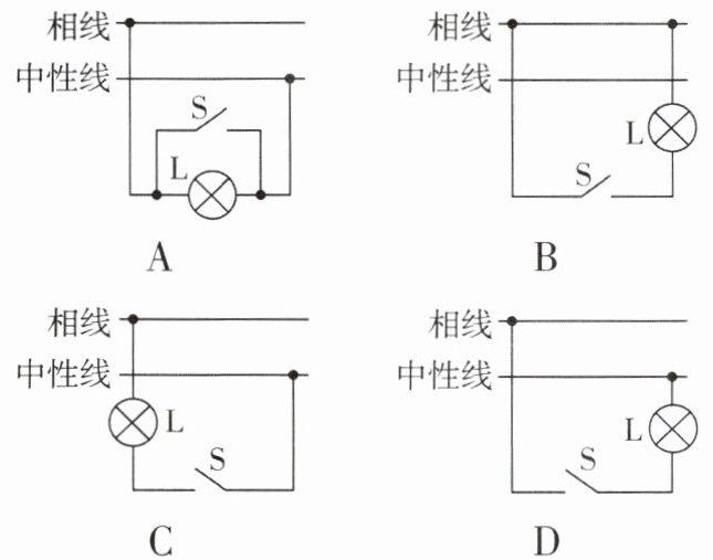 5. 在如图所示的几个家庭电路中,开关 S 和电灯 L 的接线正确的是(