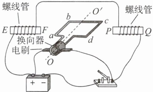3. 如图为某电动机的原理图,EF、PQ 为螺线管,abcd 为电动机的线圈,OO'为转轴. 闭合开关,从 O 点沿转轴观察,线圈顺时针转动,则(